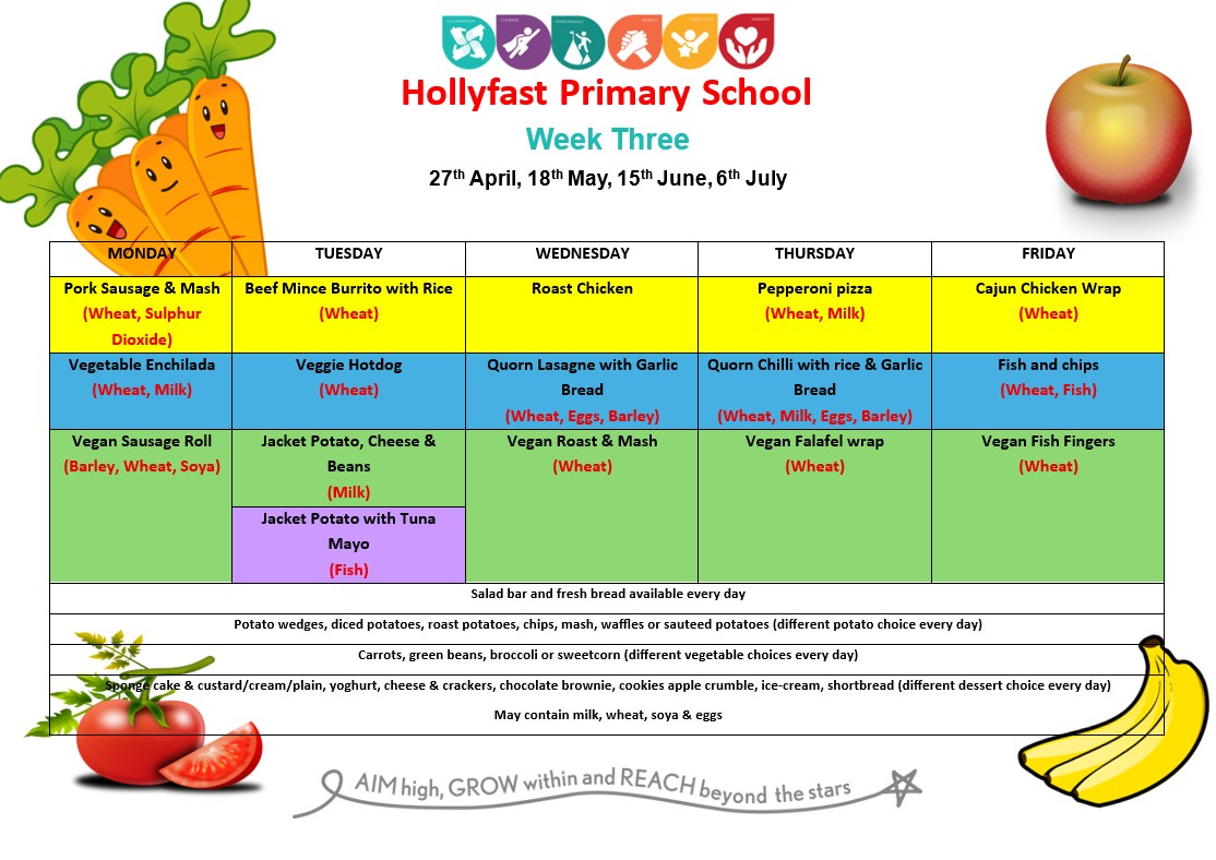 Hollyfast is a nut free school and we are keen to meet with parents of children with particular dietary needs including allergies, gluten free, wheat free and dairy free. There is always a vegetarian option. If you have any questions regarding the menu, please contact Mrs Twigg, paulatwigg@hollyfast.coventry.sch.uk