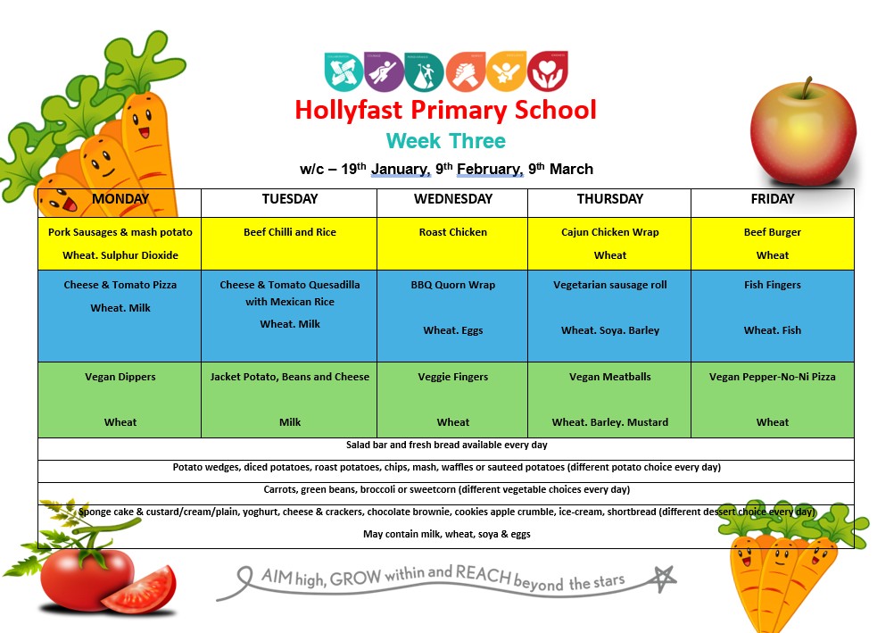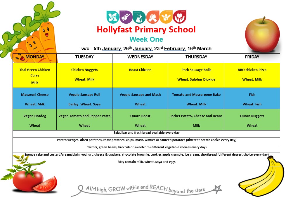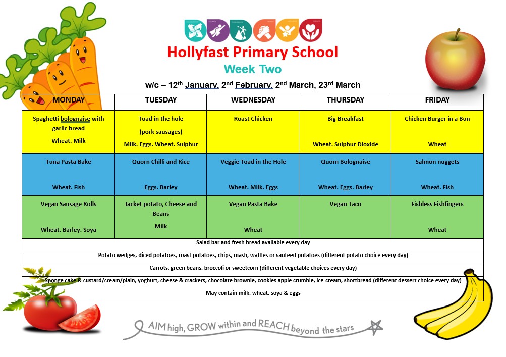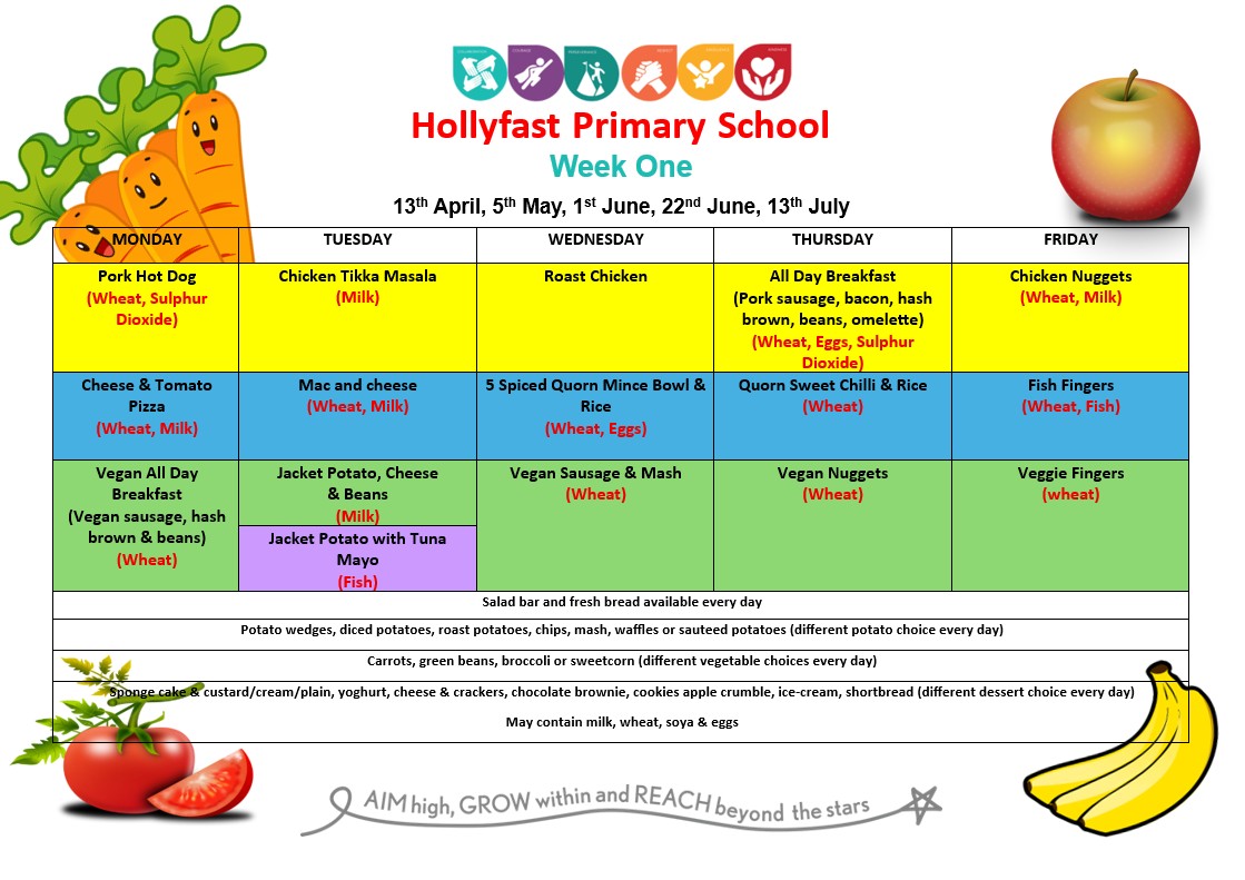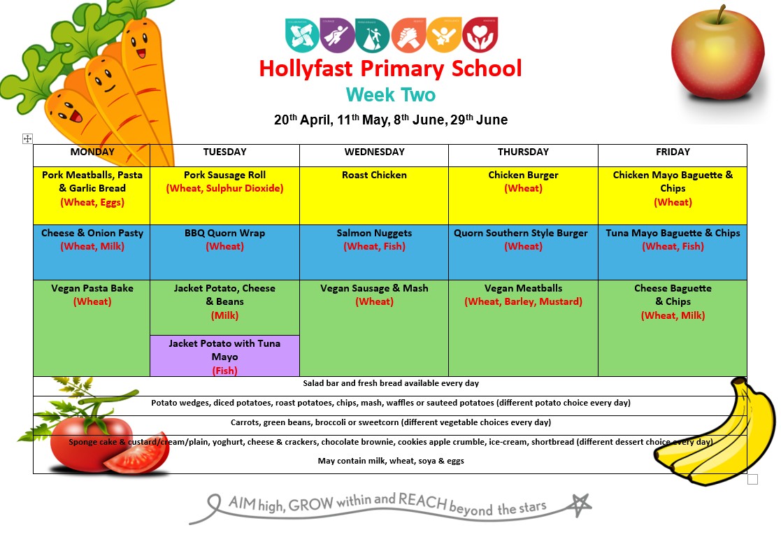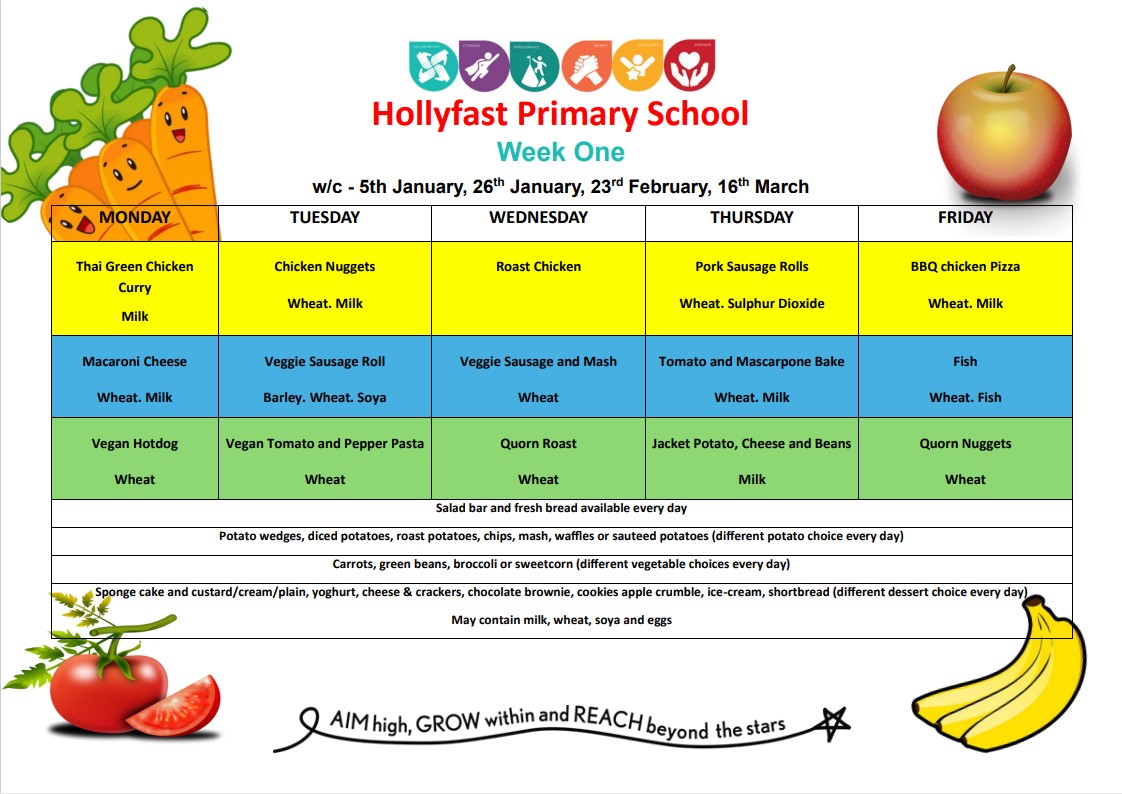 Hollyfast is a nut free school and we are keen to meet with parents of children with particular dietary needs including allergies, gluten free, wheat free and dairy free. There is always a vegetarian option. If you have any questions regarding the menu, please contact Mrs Twigg, paulatwigg@hollyfast.coventry.sch.uk
